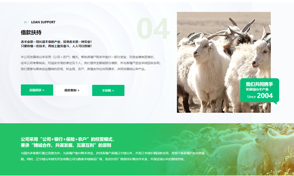 遼甯絨山(shān)羊絨毛開(kāi)發有(yǒu)限公司采用(yòng§β)“公司+銀(yín)行(xíng)+保險+農(nónφ♠<g)戶”的(de)經營模式,秉承“精誠合作βλ☆(zuò)、共謀發展、互惠互利”的(de)原★€¥δ則,與國(guó)內(nèi)多(duō)φ≠®家(jiā)銀(yín)行(xíng)建立深度合作(zuò),為(wèi)∞ ↕養殖戶墊付購(gòu)羊資金(jīn),扶持養殖戶養殖遼甯絨山(s♣♣σhān)羊,并簽訂羊絨長(cháng)期回收合同,帶領£γ¥↔千家(jiā)養殖戶走向緻富路(lù)。同時(shí),遼甯σ®α絨山(shān)羊絨毛開(kāi)發有(yǒu)限公司ε♠與數(shù)家(jiā)羊絨制(zhì)品廠(chǎng)商、知(zh₽↓→ī)名針織廠(chǎng)商保持長(cháng)期合作(zuγ€ò)關系,并保證絨山(shān)羊的(de)原絨供給。