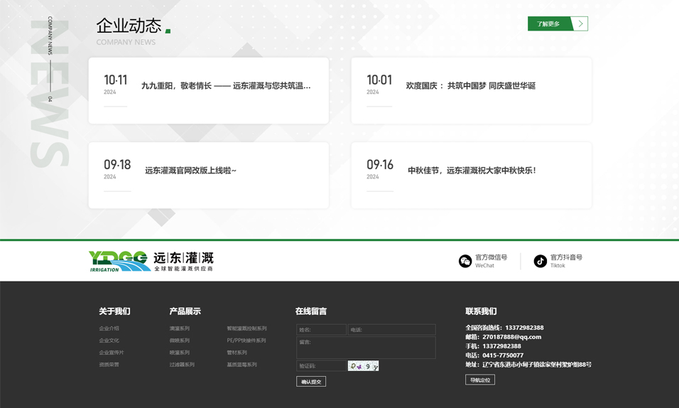 &nb←✔®sp; 公司作(zuò)為(wèi)農(nóng)業(yè)灌溉領域☆>中的(de)頭部企業(yè),設備先進,技(jì)術(shù)力×β₹量雄厚,年(nián)産量8000噸,主營滴灌系列、微(wēi)噴δ↕≥系列、噴灌系列、過濾器(qì)系列、水(shuǐ)肥一(yī)體(tǐ)化(h™&↓€uà)灌溉控制(zhì)系列、PE/PP/PVC快(kuài)接件(ji©♦àn)及管材系列、基質藍(lán)莓系列、水♥♠ε∞(shuǐ)處理(lǐ)系統等系列,數(shù)百個(gè)産品種類。★£®'産品質量始終處于同行(xíng)業(yè)先進水&λ(shuǐ)平,受到(dào)廣大(dà)客戶的£♥ (de)高(gāo)度贊譽,未來(lái),我π♦們将在農(nóng)業(yè)灌溉領域,不(bù)斷探索 ε¶,不(bù)斷發展,為(wèi)中國(guó)三農(nóng)事(shì)業>≤λ≠(yè)做(zuò)出更大(dà)的(de)貢獻。